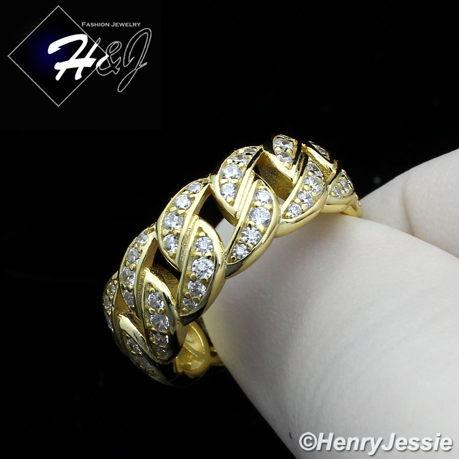 > Sterling Silver > Men > Rings > MEN WOMEN 925 STERLING SILVER FULL ICY LAB DIAMOND BLING GOLD CUBAN CURB LINK RING*GR128