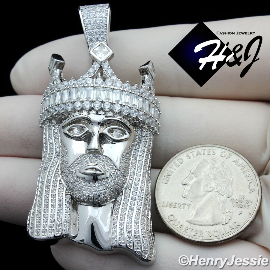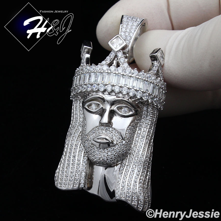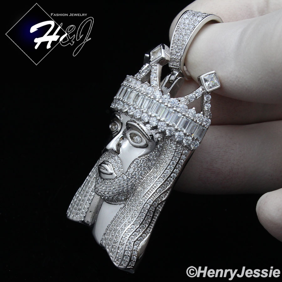 > Sterling Silver > Men > Pendants > MEN 925 STERLING SILVER ICY BAGUETTE DIAMOND SILVER 3D CROWN JESUS CROSS CHARM PENDANT*SP365