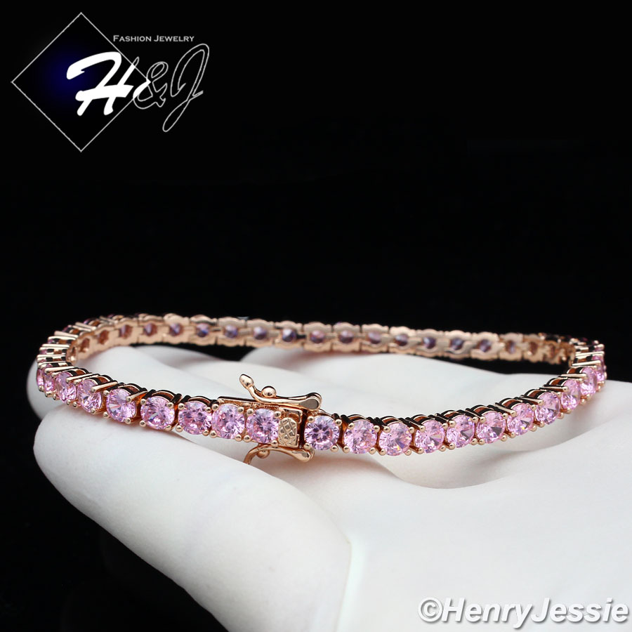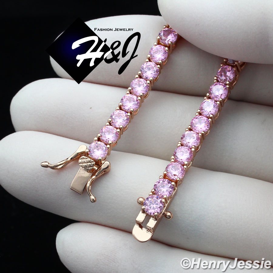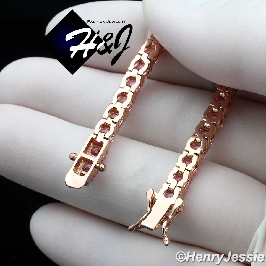 > BLING DIAMOND Jewelry > Men > Bracelets > 6.5"-8.5"WOMEN 14K ROSE GOLD FINISH 4MM ICED 1 ROW PINK TENNIS CHAIN BRACELET*BB2