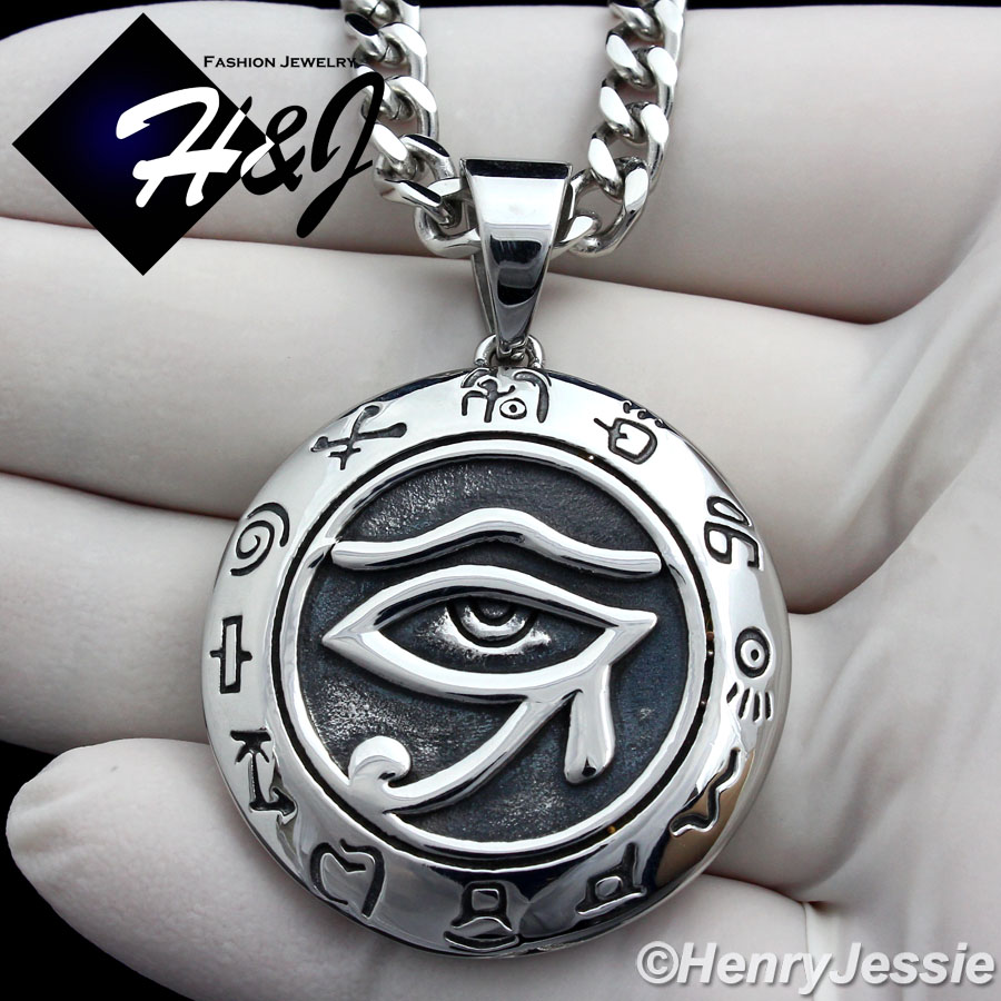 > Stainless Steel > Men > Necklace Pendant SETS > 18"-36"MEN Stainless Steel 5mm Silver Cuban Curb Link Chain Necklace Eye of Horus Round Pendant*P92