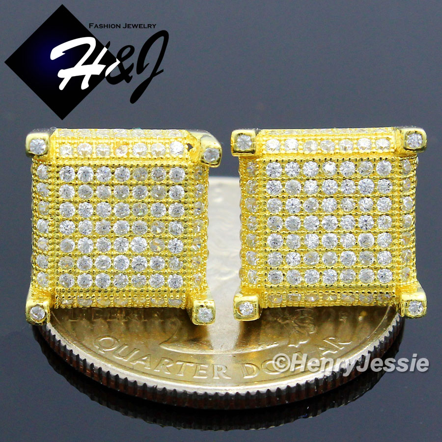 > Sterling Silver > Men > Earrings > MEN 925 STERLING SILVER SQUARE 11MM LAB DIAMOND ICED GOLD STUD EARRING*E89