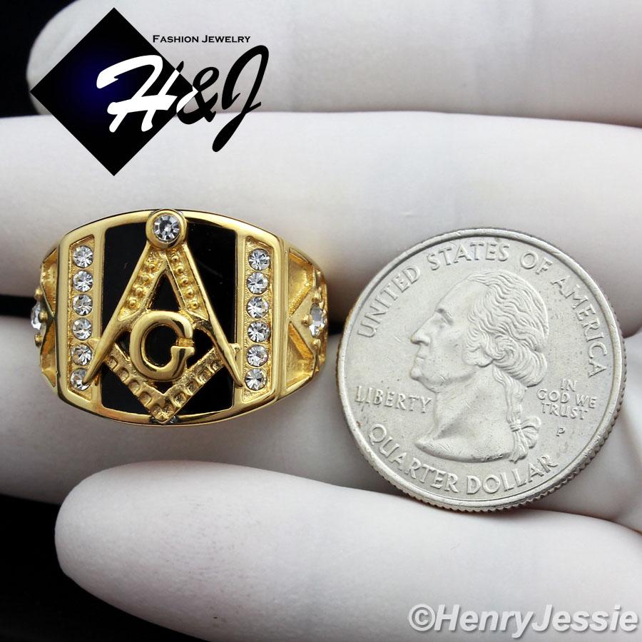 > Stainless Steel > Men > Rings > MEN's Stainless Steel Gold Black Onyx MASONIC CZ Ring Size 8-13*GR94