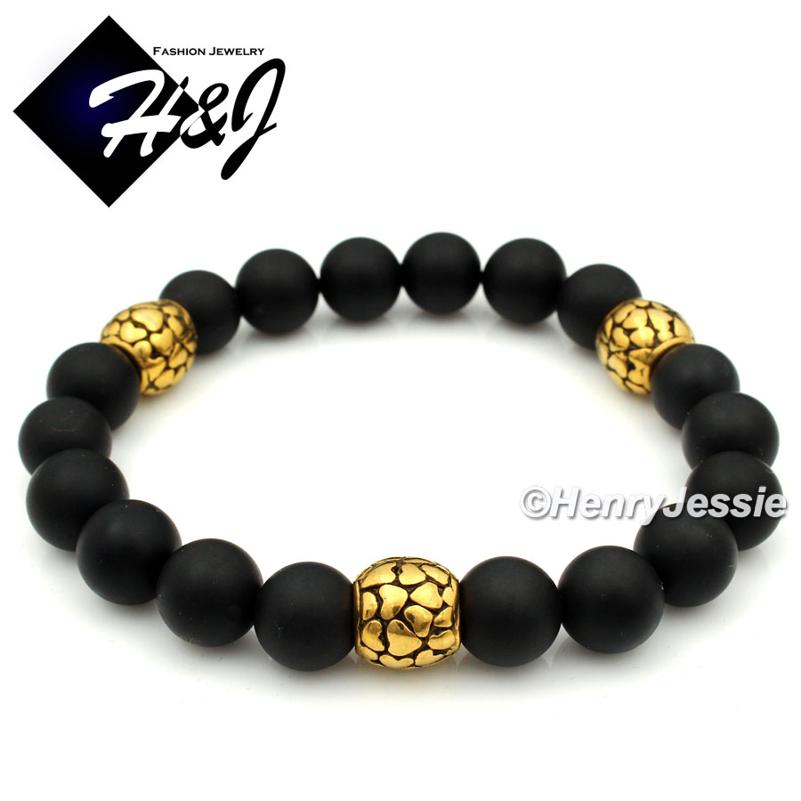 Your Position: Home > Fashion Jewelry > Men > Bracelets > MEN Stainless Steel 10mm Brush Black Onyx Beads Gold Beads Stretchy Bracelet*GB7