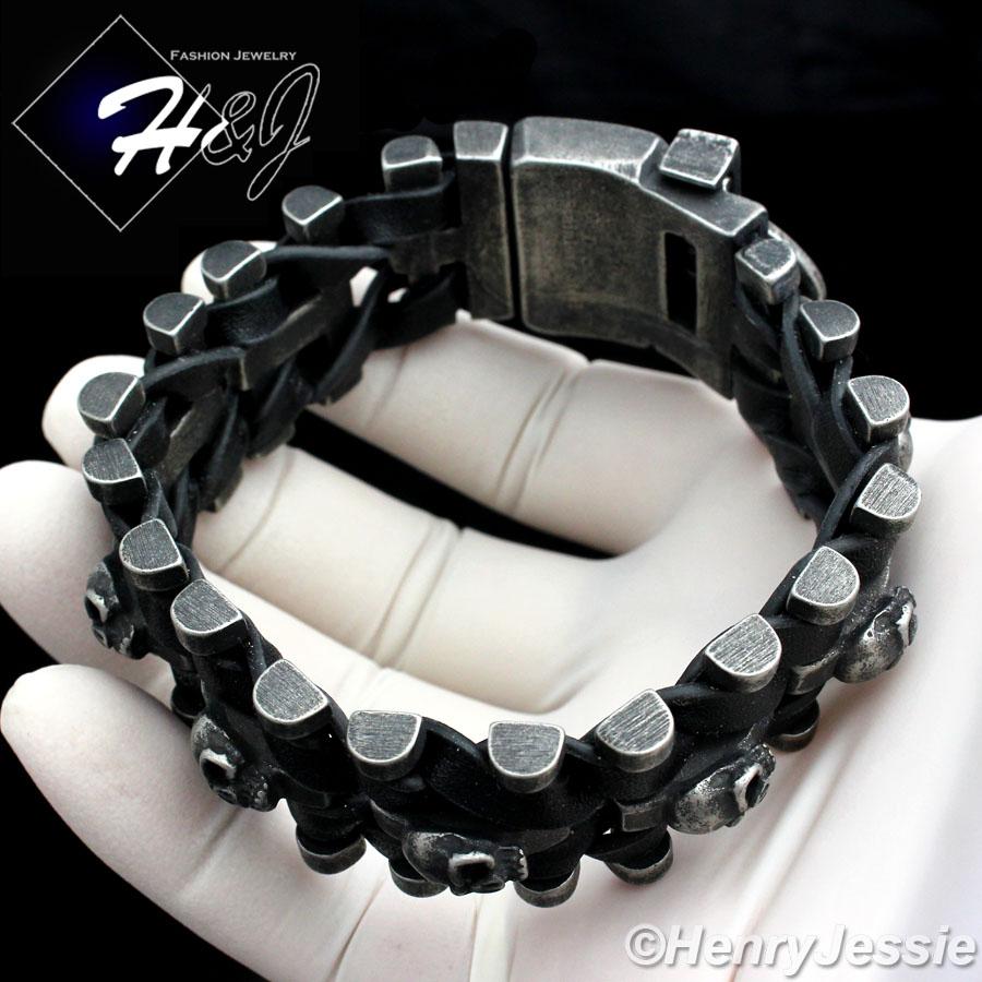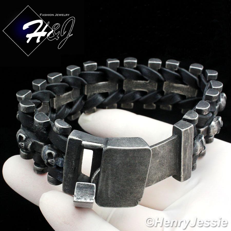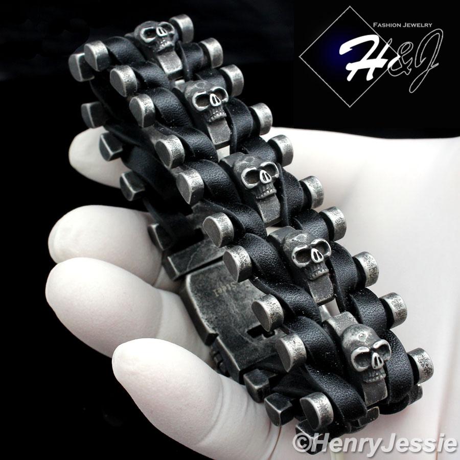 > Stainless Steel > Men > Bracelets > 9"BIKER MEN Stainless Steel WIDE 25mm Gray Skull Heads Black Leather Bracelet