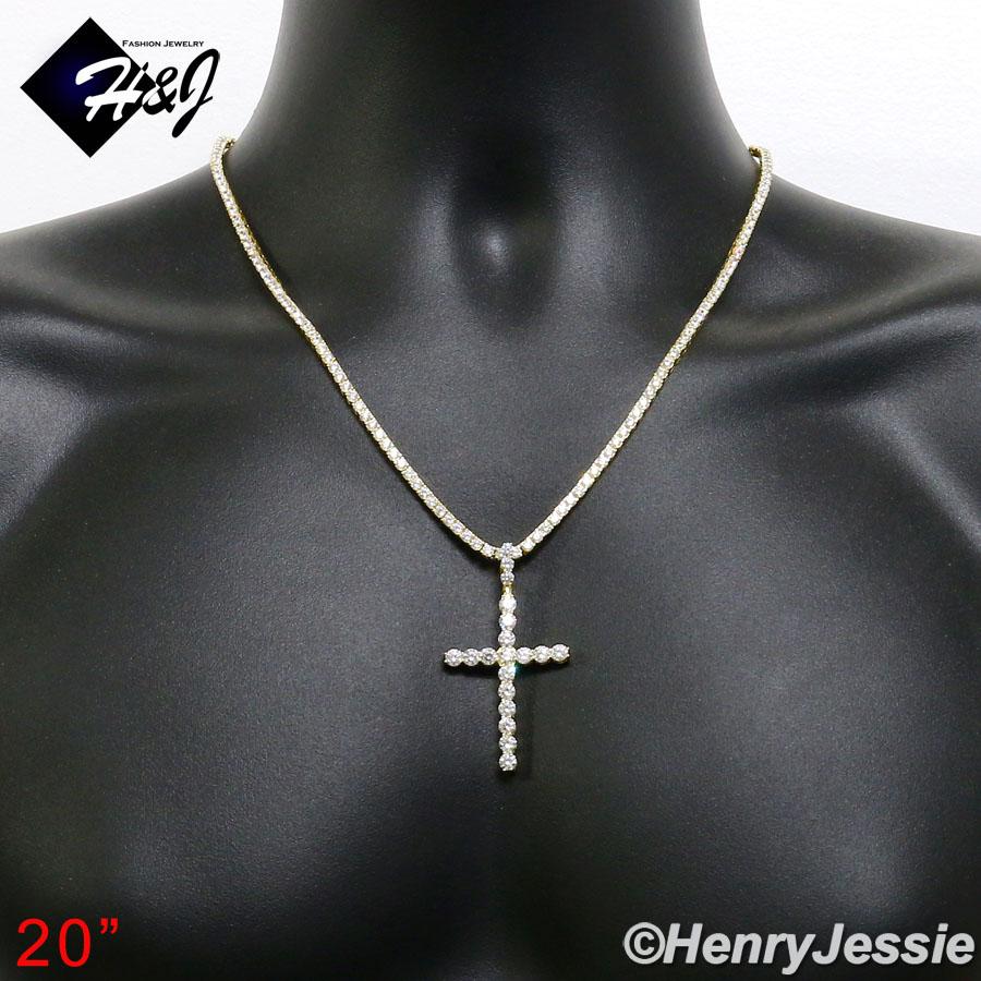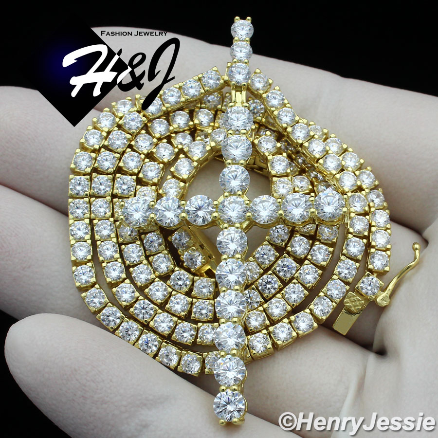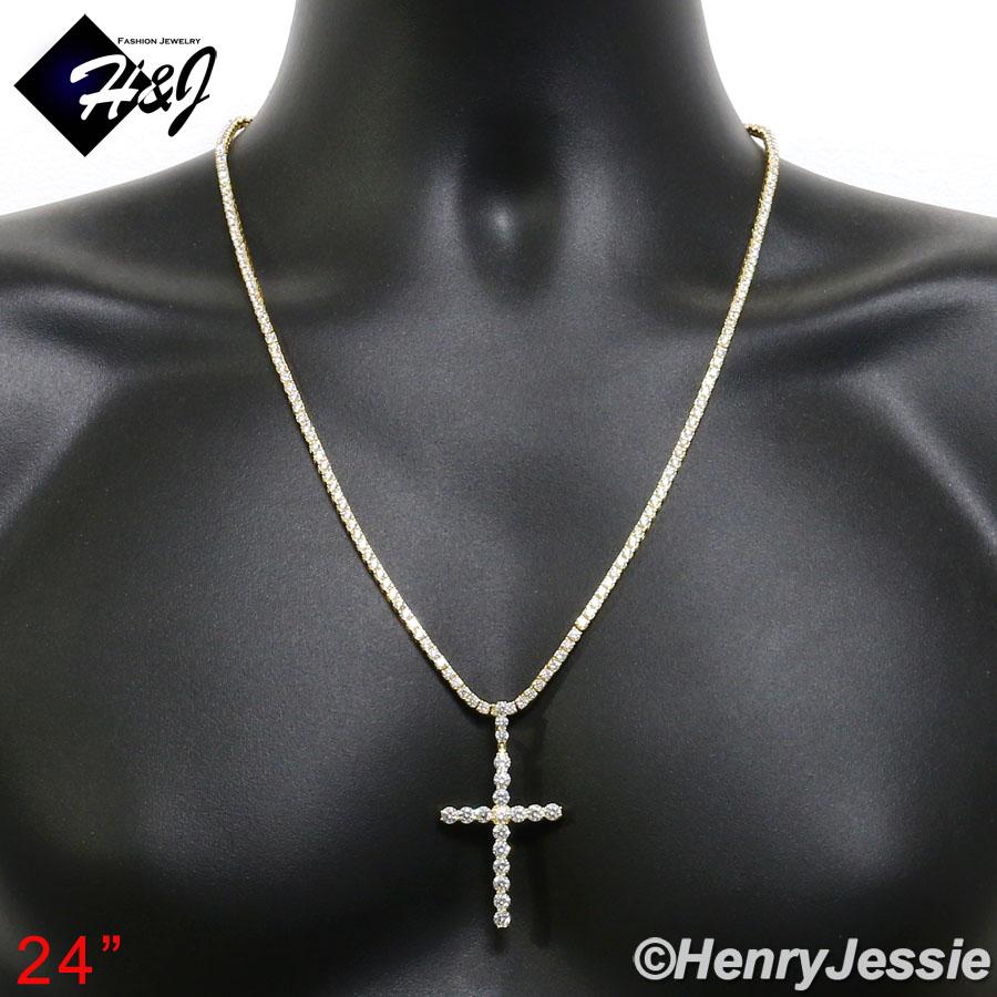 > Sterling Silver > Men > Necklace Pendant SETS > 20"-28"MEN 925 STERLING SILVER 3MM GOLD ICED BLING 1 ROW TENNIS CHAIN CROSS PENDANT*GP170