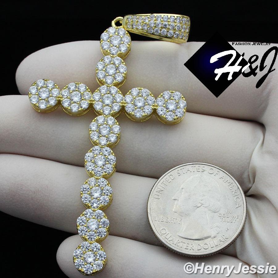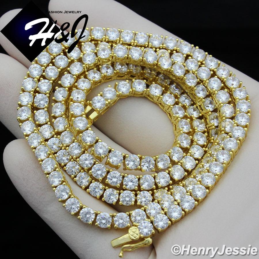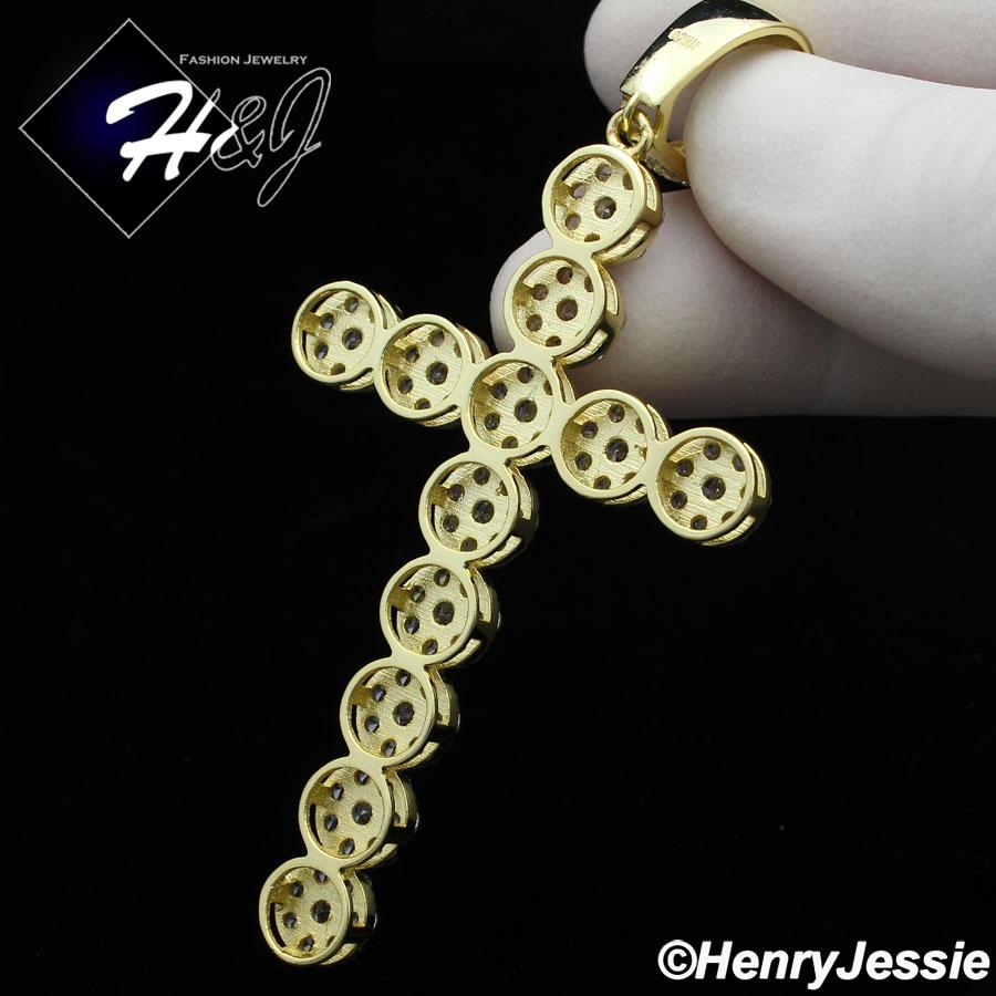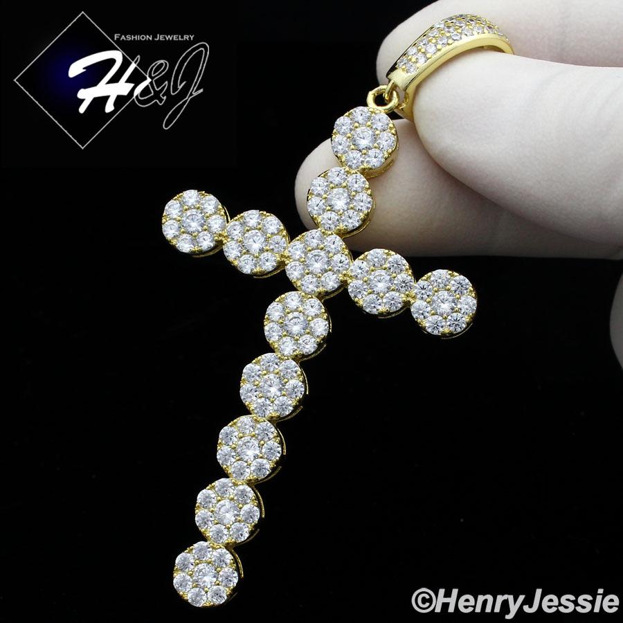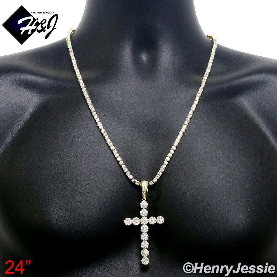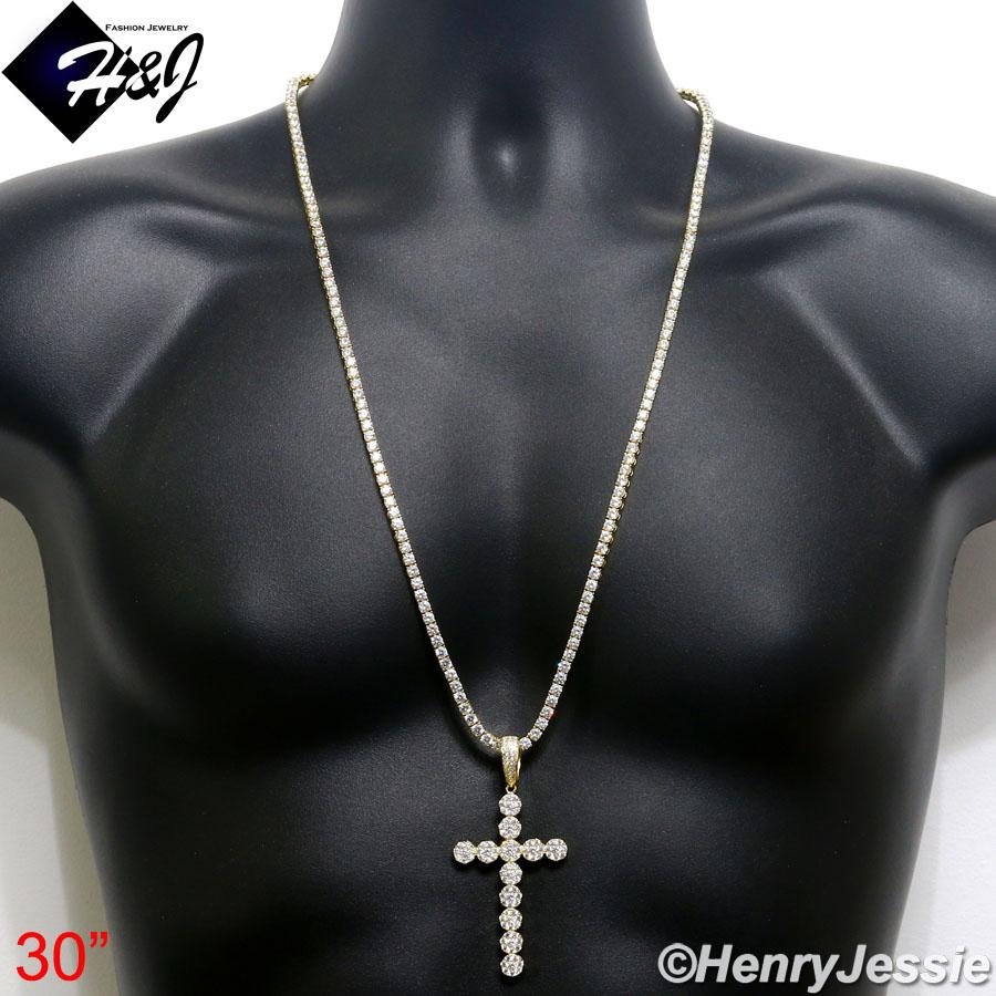 > Sterling Silver > Men > Necklace Pendant SETS > 18"-30"MEN 925 STERLING SILVER 4MM GOLD ICED BLING 1 ROW TENNIS CHAIN CROSS PENDANT*GP193