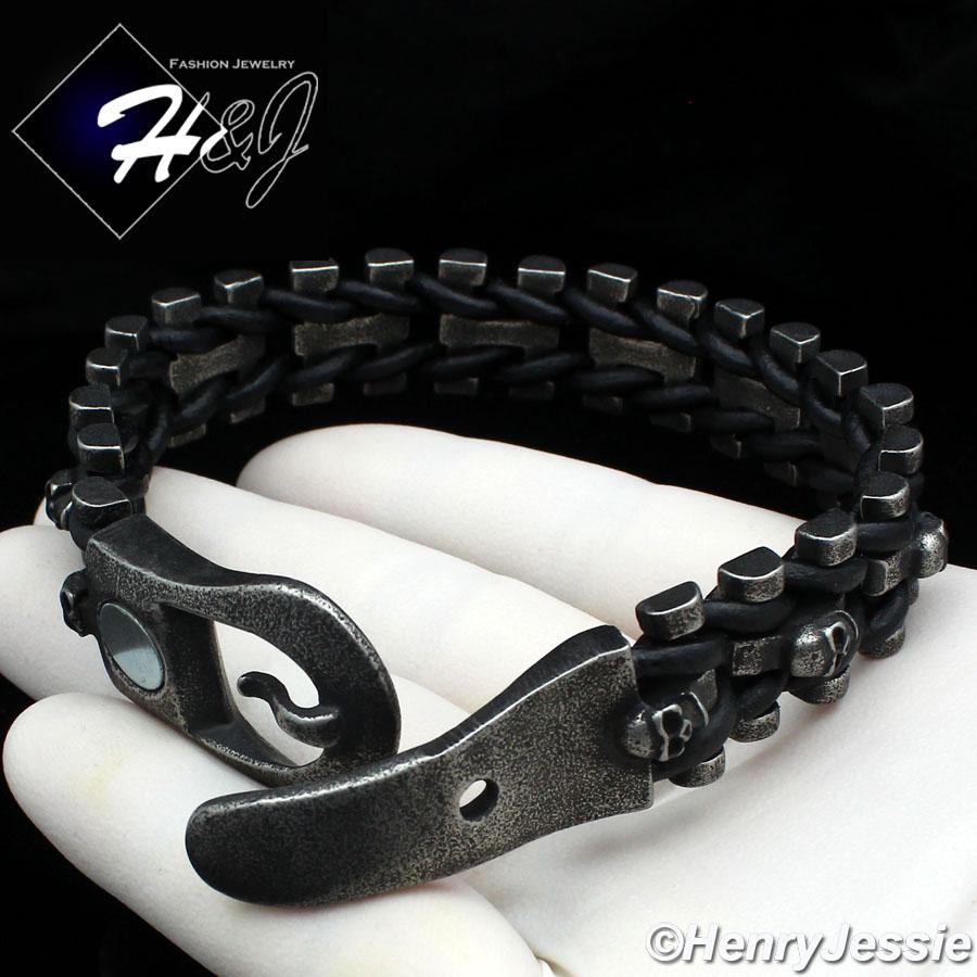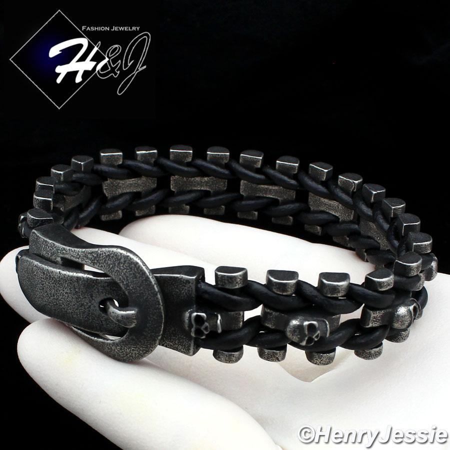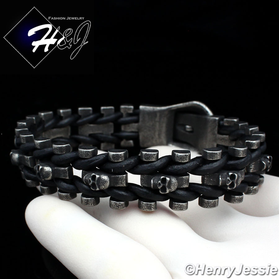 > Stainless Steel > Men > Bracelets > 8.5"BIKER MEN Stainless Steel 15mm Gray Skull Heads Black Leather Bracelet