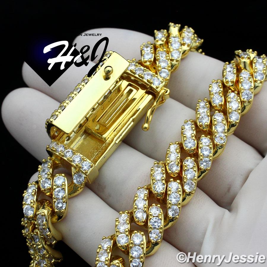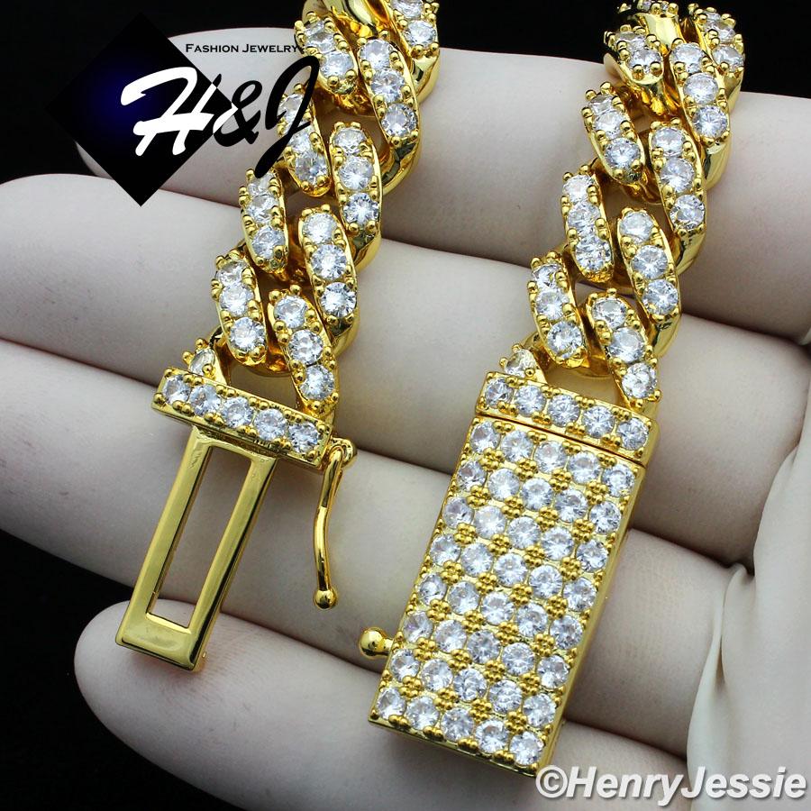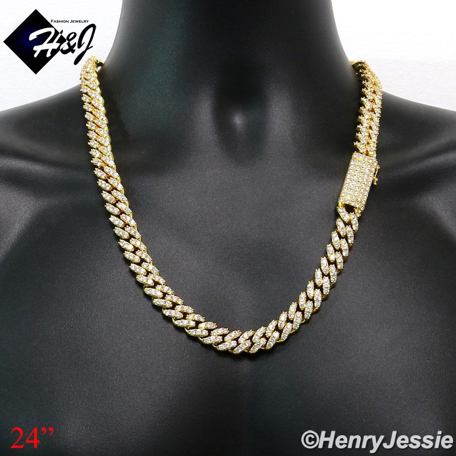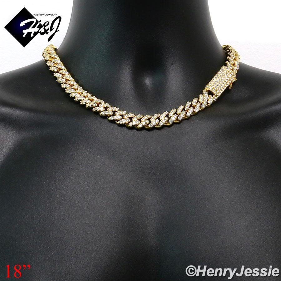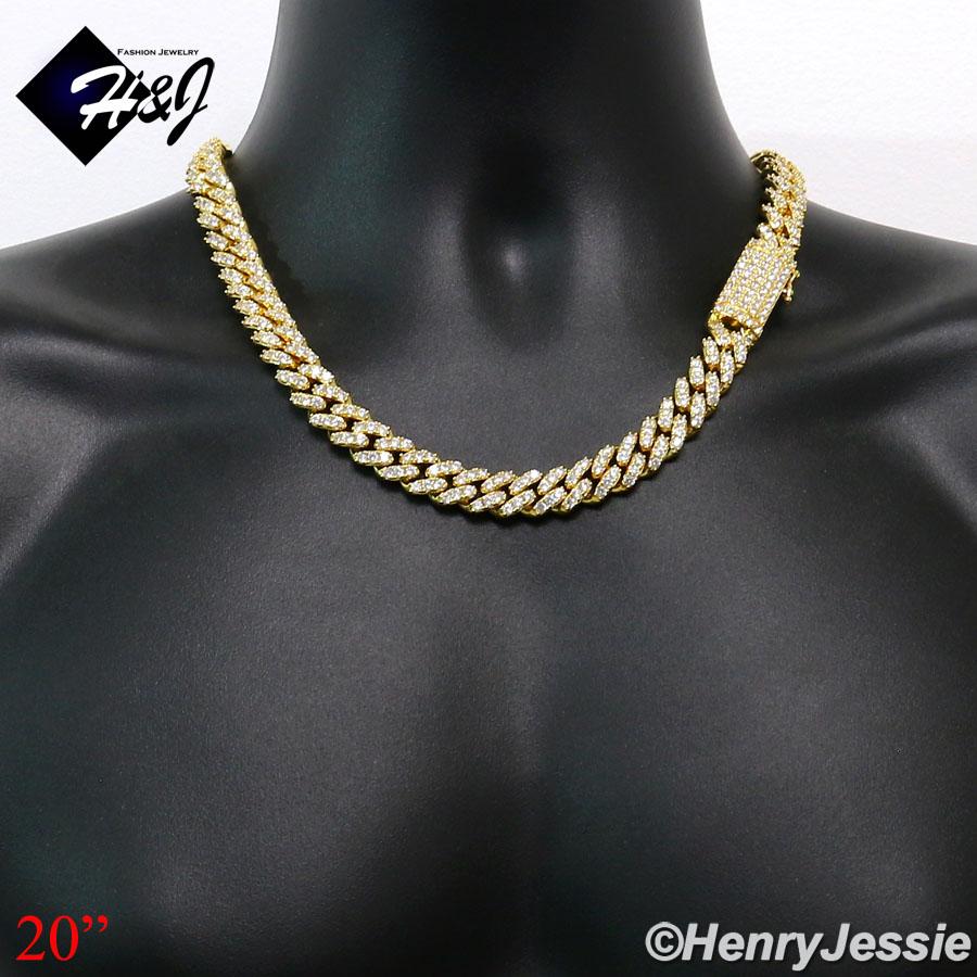 > BLING DIAMOND Jewelry > Men > Necklaces > 18"-24"MEN 14K GOLD FINISH 12MM GOLD ICED BLING PRONG SET CUBAN CURB CHAIN NECKLACE*BGN5