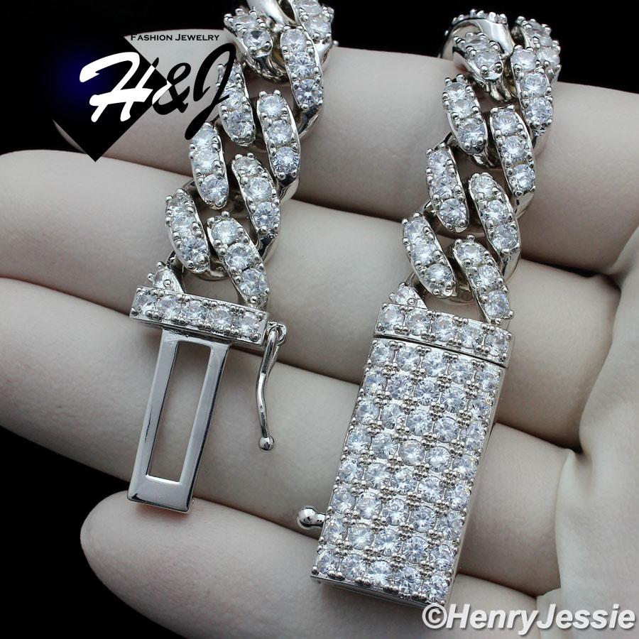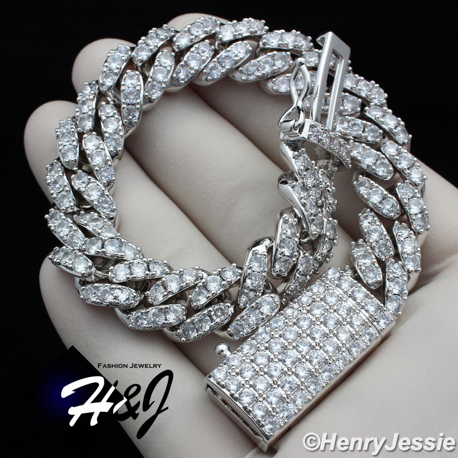 > BLING DIAMOND Jewelry > Men > Bracelets > 8.5"MEN 14K WHITE GOLD FINISH 12MM ICED BLING SILVER PRONG SET CUBAN CHAIN BRACELET*BB5